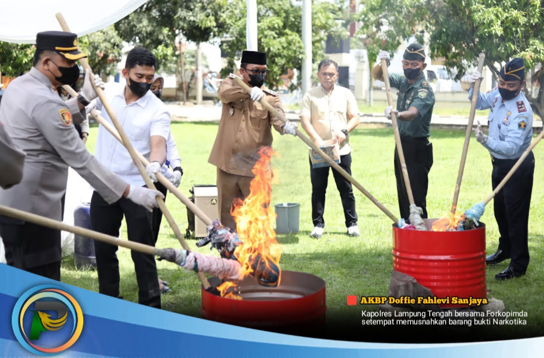 Kegiatan yang dipimpin langsung oleh Kapolres Lampung Tengah, AKBP Doffie Fahlevi Sanjaya, S.I.K, M.Si itu dihadiri Wakil Bupati Lampung Tengah dr. Ardito Wijaya, Kepala BNN setempat diwakili Dahruf Ansori, S.HI., M.HI, jajaran Forkopimda dan para PJU Polres setempat.
