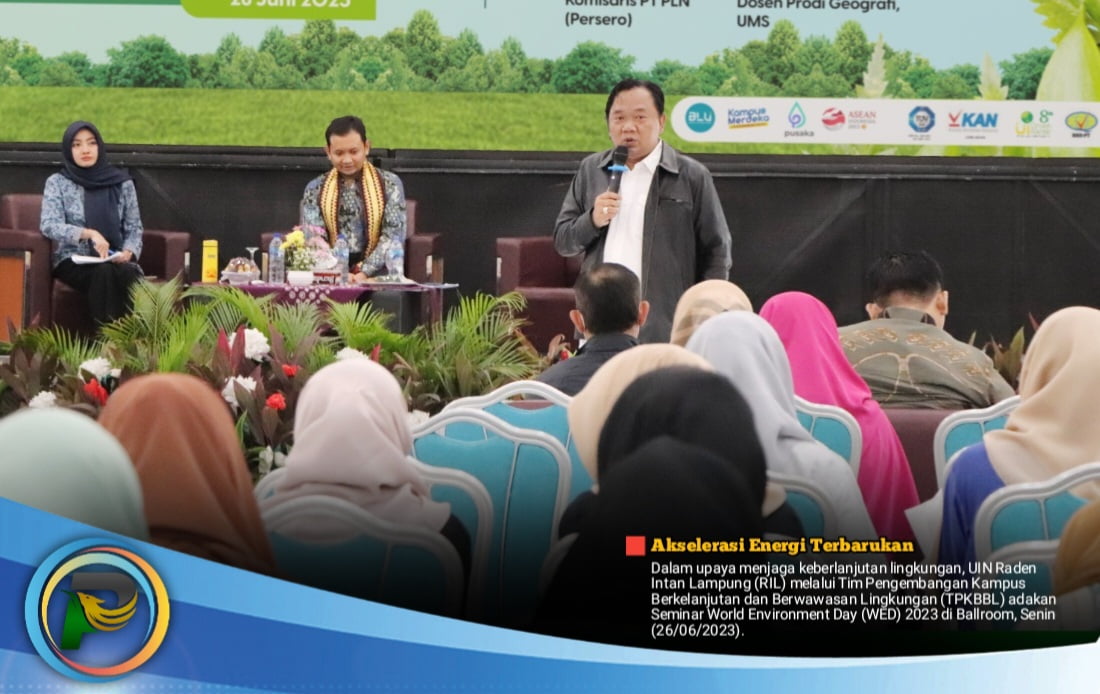 Dr Safari Daud MSosI selaku Pelaksana Tugas Rektor sekaligus Wakil Rektor (WR) II membuka seminar tersebut dan menyampaikan salah satu fokus UIN Raden Intan Lampung sebagai kampus hijau adalah bagaimana melakukan efisiensi energi yang ada di kampus yaitu dengan penghematan listrik.
