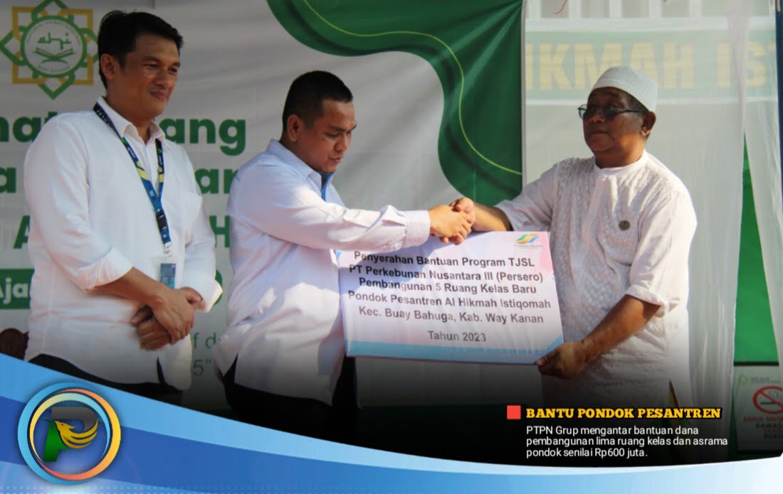 “Apresiasi tinggi kepada semua insan Yayasan Alhikmah Istiqomah. Oleh karena itu, sebagai wujud apresiasi PTPN III Holding, kami menyampaikan bantuan dari Program TJSL atau CSR kepada yayasan. Bantuan berupa dana Rp600 juta untuk pembangunan lima ruang kelas pondok pesantren,” kata Kadiv bergelar doktor ilmu hukum usai menyerahkan bantuan secara simbolis dan diterima Pengasuh Pondok Pesantren Alhikmah Istiqomah KH. Imam Sahuri.