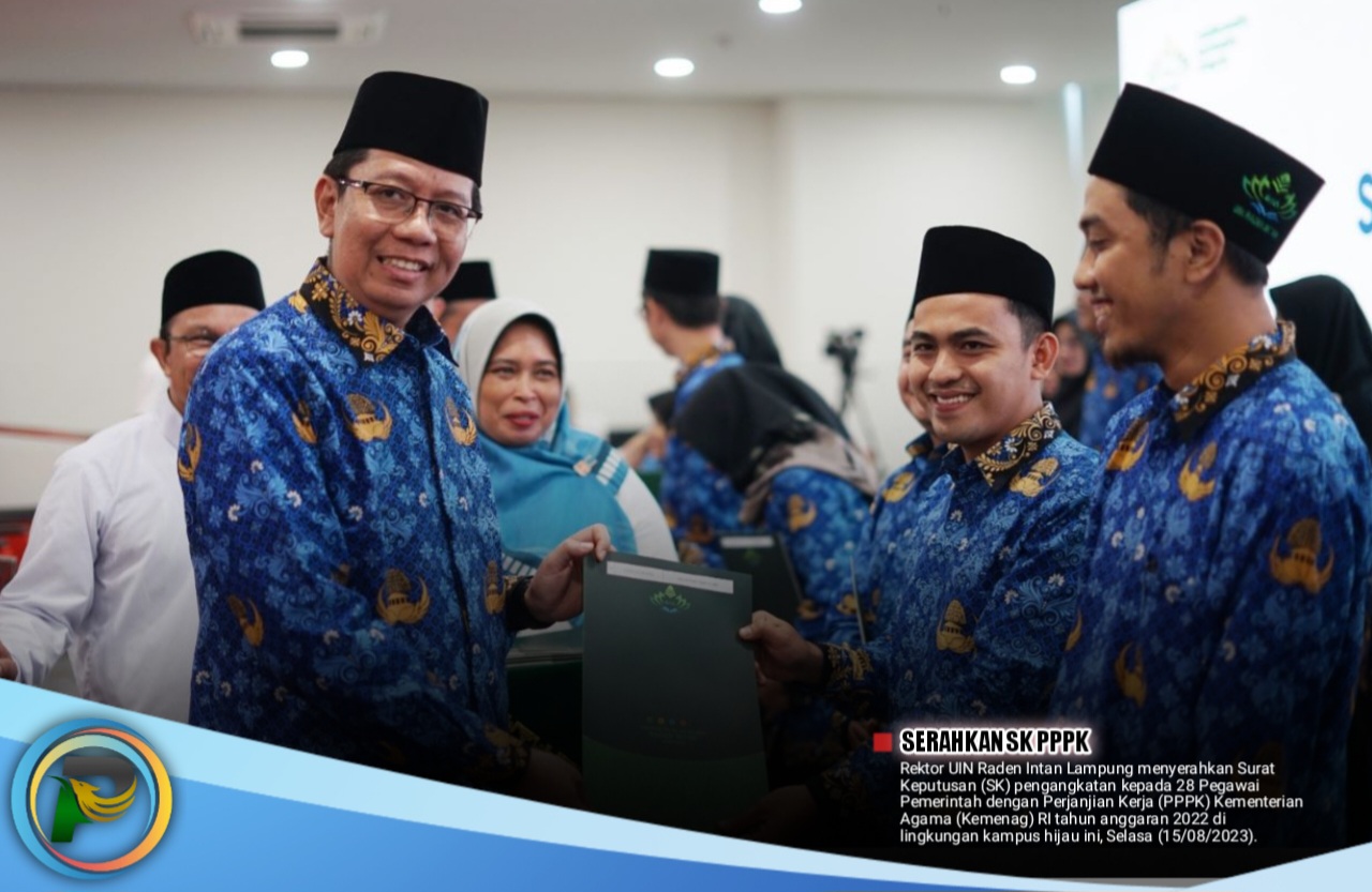 psiaceh.or.id/ – Rektor UIN Raden Intan Lampung menyerahkan Surat Keputusan (SK) pengangkatan kepada 28 Pegawai Pemerintah dengan Perjanjian Kerja (PPPK) Kementerian Agama (Kemenag) RI tahun anggaran 2022 di lingkungan kampus hijau ini, Selasa (15/08/2023).